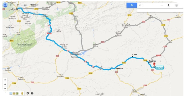 En venant d'Alnif et Rrissani ou Merzougaou , on traverse tout le village de Tazzarine en continuant tout droit vers la route de Taghbalte (en laissant à droite la direction de Ouarzazate), traverser le pont puis faire 12 km de la route goudronner puis suivre à gauche le fléchage sur 6 km de piste.